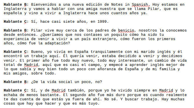A continuación vemos una captura del resultado esperado una vez realizada la transcripción del audio (solo el comienzo de 3 páginas de dialogo):